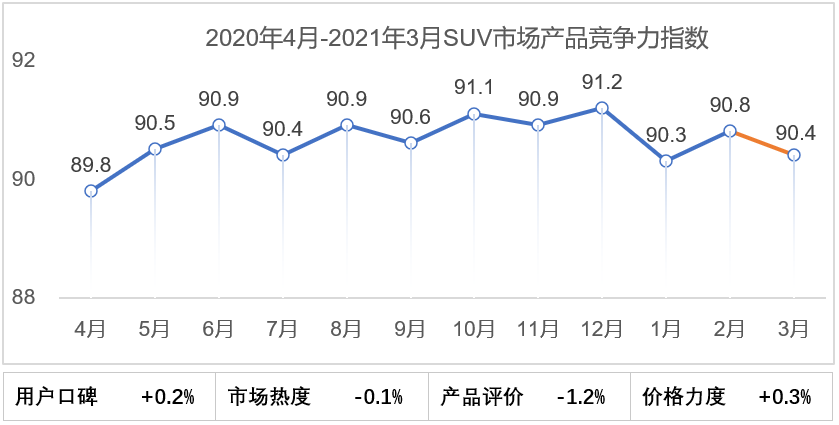 2021年3月SUV市场产品竞争力指数为90.4,环比下滑0.4个点,用户口碑和价格力度环比小幅提升,其中产品评价环比下滑较大,达到1.2个点。