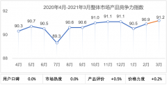 以2019年1月为基期,2021年3月整体市场产品竞争力指数为91.2,环比上月提升0.3个点;从三大细分市场来看,轿车环比提升0.5个点,SUV环比则下滑0.4个点,MPV由于市场体量较小,且受春节影响,波动较大,环比提升4.7个点。