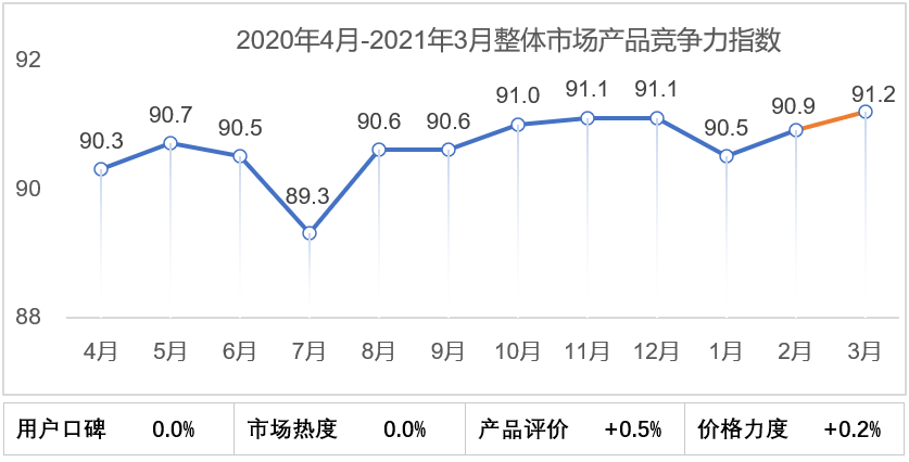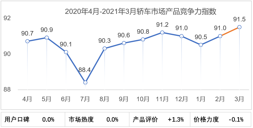 总体来看,2021年3月轿车市场产品竞争力指数为91.5,环比提升0.5个点,产品评价提升1.3个点,价格力度下滑0.1个点,其余环比保持不变。