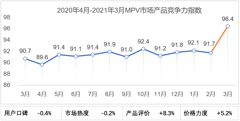 2021年3月MPV市场产品竞争力指数为96.4,环比提升4.7个点,其中产品评价和价格力度环比提升较大,分别达到8.3和5.2个点。