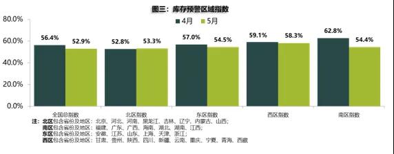 从区域指数情况看:5月全国总指数为52.9%,北区指数为53.3%,东区指数为54.5%,西区指数为58.3%,南区指数为54.4%。进入5月,汽车市场需求有所增加,但芯片短缺导致供给有所下降,订单延后,各区库存预警指数下降。