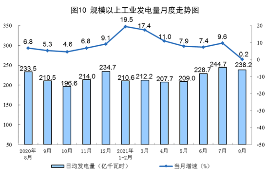 电力增幅回落较大。8月份,发电7383亿千瓦时,同比增长0.2%,增速比上月回落9.4个百分点,比2019年同期增长7.1%,两年平均增长3.5%,日均发电238.2亿千瓦时。1—8月份,发电53894亿千瓦时,同比增长11.3%,比2019年同期增长11.6%,两年平均增长5.7%。