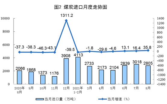 原煤生产由降转升。8月份,生产原煤3.4亿吨,同比增速由上月下降3.3%转为增长0.8%,比2019年同期增长0.7%,两年平均增长0.3%,日均产量1081万吨。进口煤炭2805万吨,同比增长35.8%。