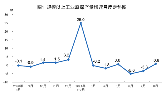 8月份,规模以上工业原煤生产由降转升,原油生产平稳增长,天然气增长有所加快,电力增幅回落较大。以2019年8月份为基期,原煤生产两年平均增速由负转正,原油生产保持平稳,天然气、电力生产增长较快。