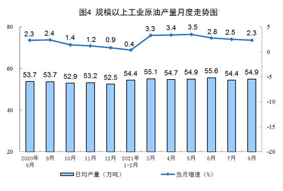 1—8月份,生产原油13322万吨,同比增长2.4%,比2019年同期增长4.0%,两年平均增长2.0%;加工原油47079万吨,同比增长7.4%,比2019年同期增长10.8%,两年平均增长5.3%。