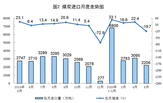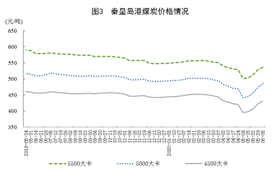 煤炭进口大幅下降,港口交易价格止跌回升。 5 月份,进口煤炭 2206 万吨,环比减少 889 万吨,同比下降 19.7% ; 1 — 5 月份,进口煤炭 1.49 亿吨,同比增长 16.8% 。港口煤炭综合交易价格止跌回升, 6 月 5 日秦皇岛港 5500 、 5000 和 4500 大卡煤炭价格分别为每吨 536 元、 485 元和 431 元,比 5 月 8 日的年内最低点分别回升 35 元、 43 元和 35 元。