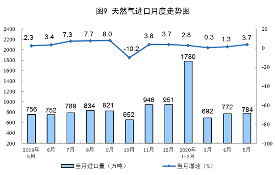 天然气进口稳定增长。 5 月份,进口天然气 784 万吨,同比增长 3.7% 。 1 — 5 月份,进口天然气 4012 万吨,同比增长 1.9% 。