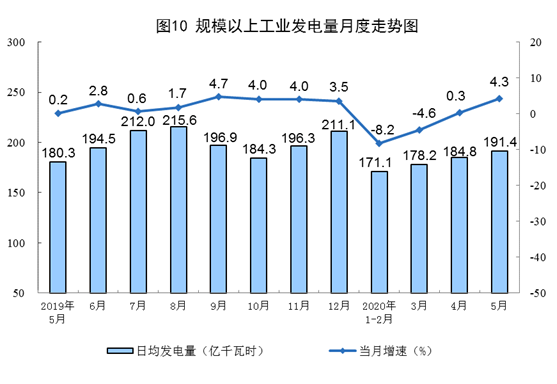 电力生产明显加快。 5 月份,发电量 5932 亿千瓦时,同比增长 4.3% ,比上月加快 4.0 个百分点,日均发电量 191.4 亿千瓦时,环比增加 6.6 亿千瓦时。 1 — 5 月份,发电量 27325 亿千瓦时,同比下降 3.1% 。