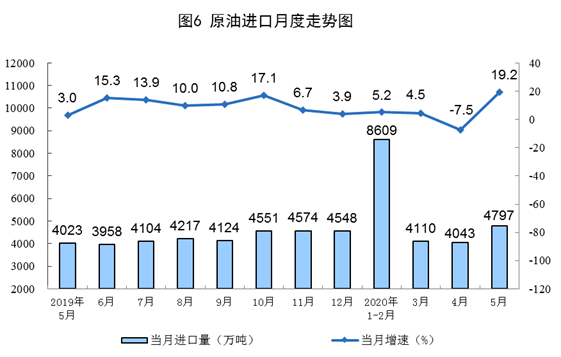 原油进口由降转增,国际原油价格快速回升。 5 月份,进口原油 4797 万吨,同比增长 19.2% ,上月为下降 7.5% 。 1 — 5 月份,进口原油 21558 万吨,同比增长 5.2% 。 5 月 29 日布伦特原油现货离岸价格为 34.15 美元 / 桶,比 4 月 30 日的 18.11 美元 / 桶回升 88.6% 。