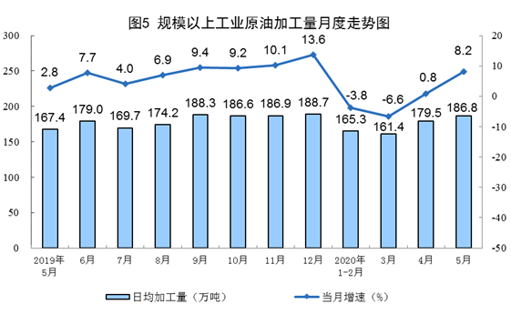 原油生产有所加快,加工量较快增长。 5 月份,生产原油 1646 万吨,同比增长 1.3% ,增速比上月加快 0.4 个百分点;加工原油 5790 万吨,增长 8.2% ,比上月加快 7.4 个百分点。 1 — 5 月份,生产原油 8090 万吨,同比增长 1.9% ;加工原油 26139 万吨,下降 1.0% 。