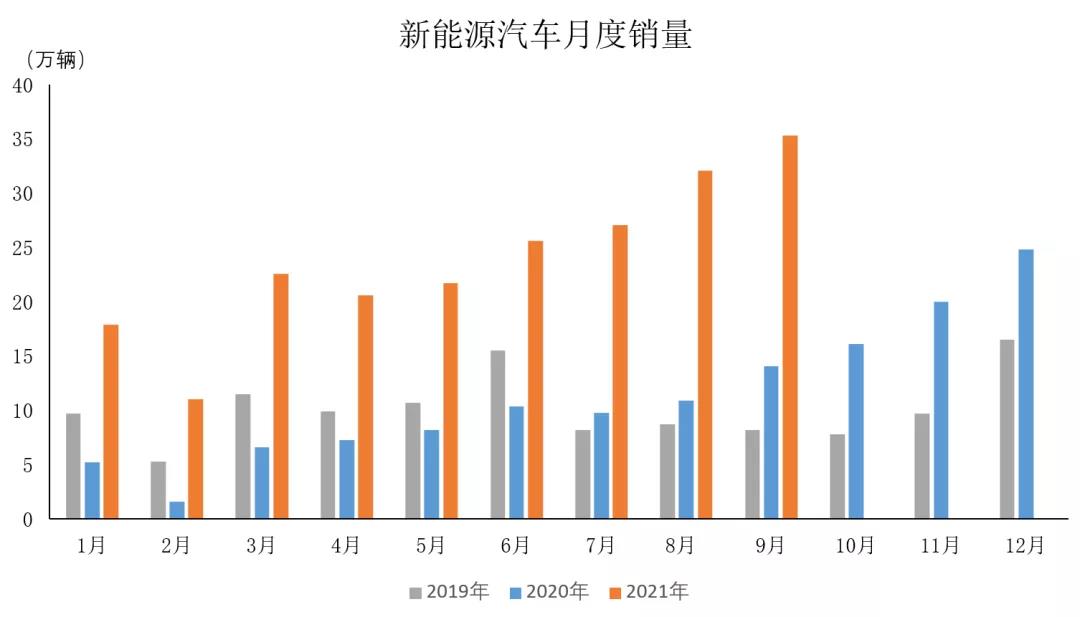 2021年9月,新能源汽车产销分别达到35.3万辆和35.7万辆,环比增长14.5%和11.4%,同比增长均为1.5倍。