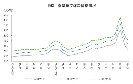 煤炭价格回落。12月31日,秦皇岛港5500大卡、5000大卡和4500大卡动力煤综合交易价格分别为每吨773元、692元和584元,比11月26日分别回落213元、199元和208元。