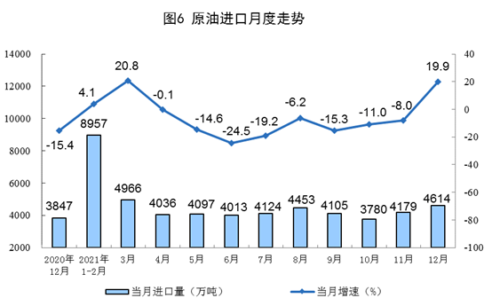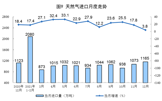 天然气进口增速回落。12月份,进口天然气1165万吨,同比增长3.8%,增速比上月回落14.0个百分点。2021年,进口天然气12136万吨,比上年增长19.9%。