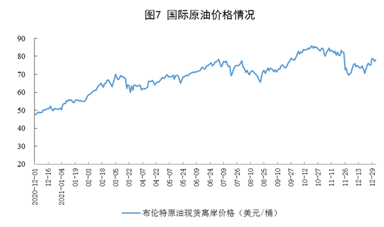 原油进口由降转增,国际原油价格上涨。12月份,进口原油4614万吨,同比增长19.9%,上月为下降8.0%;2021年,进口原油51298万吨,比上年下降5.4%。12月31日,布伦特原油现货离岸价格为77.24美元/桶,比11月30日的70.86美元/桶上涨9.0%。