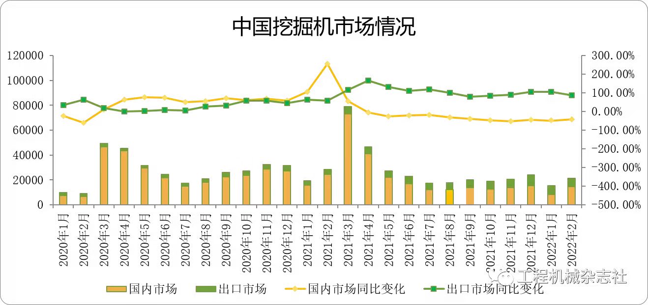 经草根调查和市场研究,CME预估2022年2月挖掘机(含出口)销量22000台左右,同比增速-22%左右,降幅基本持平。