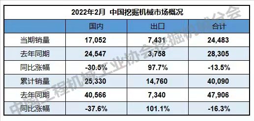 据中国工程机械工业协会对26家挖掘机制造企业统计,2022年2月销售各类挖掘机24483台,同比下降13.5%;其中国内17052台,同比下降30.5%;出口7431台,同比增长97.7%。