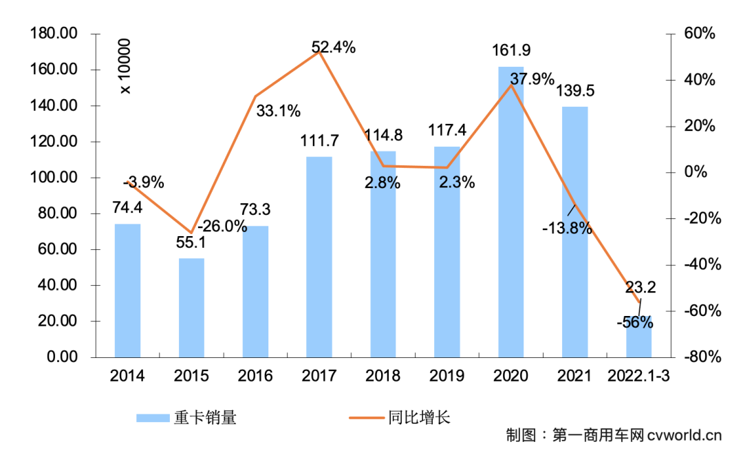 2014-2022年我国重卡市场销量年度走势图(单位:万辆)