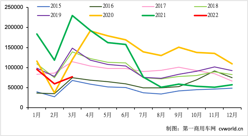 2015-2022年我国重卡市场销量月度走势图(单位:辆)