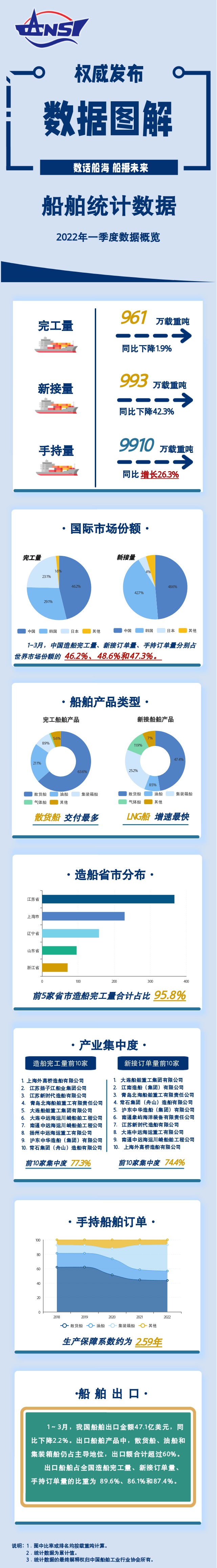 2022年1-3月,全国造船完工961万载重吨,同比下降1.9%。承接新船订单993万载重吨,同比下降42.3%。3月底,手持船舶订单9910万载重吨,同比增长26.3%。