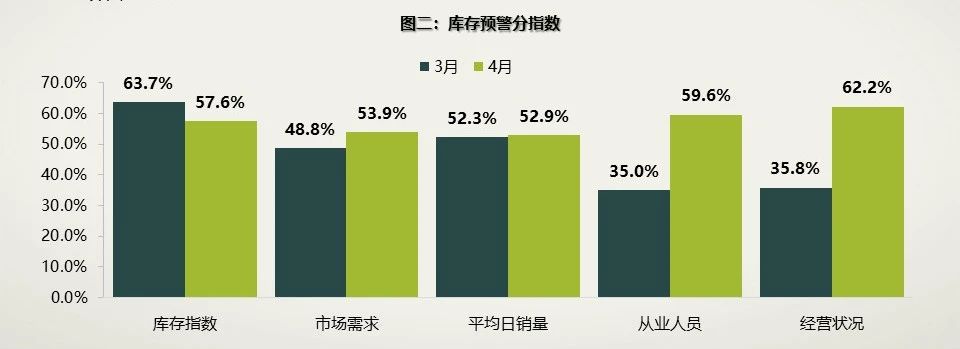 从分指数情况看:调查显示,4月份库存指数环比下降,市场需求指数、平均日销量指数、从业人员指数、经营状况指数环比上升。