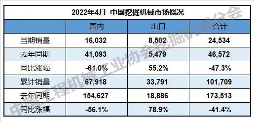 据中国工程机械工业协会对26家挖掘机制造企业统计,2022年4月销售各类挖掘机24534台,同比下降47.3%。其中,国内16032台,同比下降61%;出口8502台,同比增长55.2%。