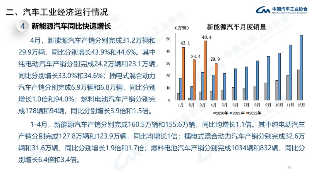 5月11日,从中国汽车工业协会获悉,中国4月份汽车销量104万辆,同比下降50.6%;1-4月累计汽车销量696.7万辆,同比下降15.4%。4月份新能源汽车销量29.9万辆,同比上涨44.6%。