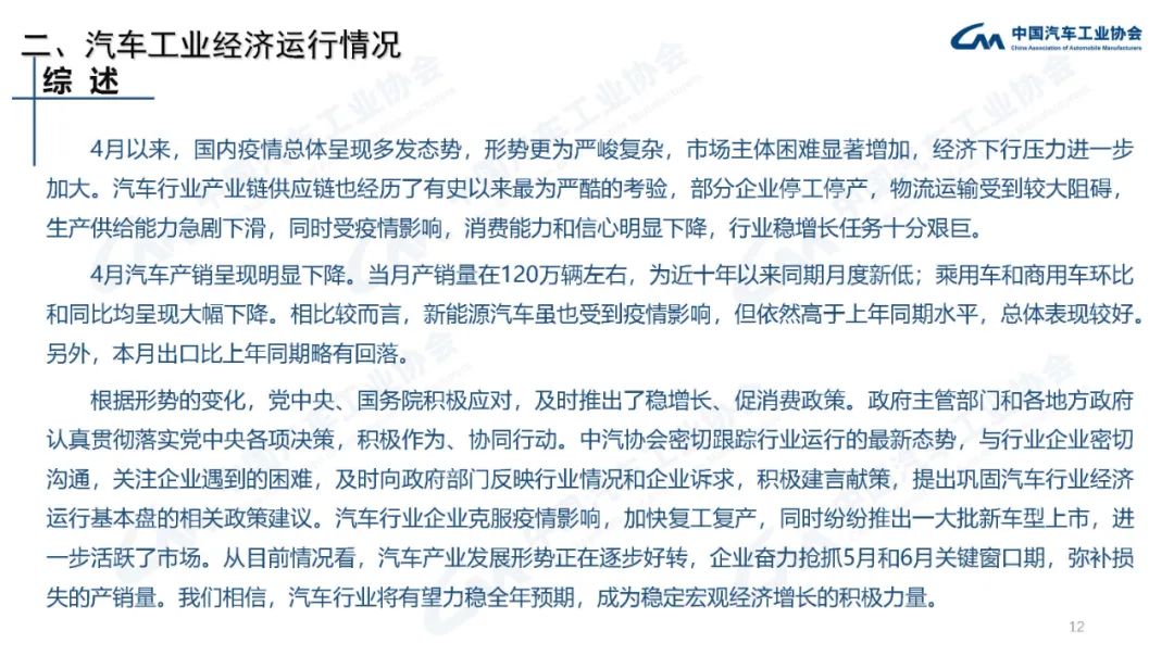 2022年4月汽车产销呈现明显下降。当月产销量在120万辆左右,为近十年以来同期月度新低;乘用车和商用车环比和同比均呈现大幅下降。相比较而言,新能源汽车虽也受到疫情影响,但依然高于上年同期水平,总体表现较好。另外,本月出口比上年同期略有回落。