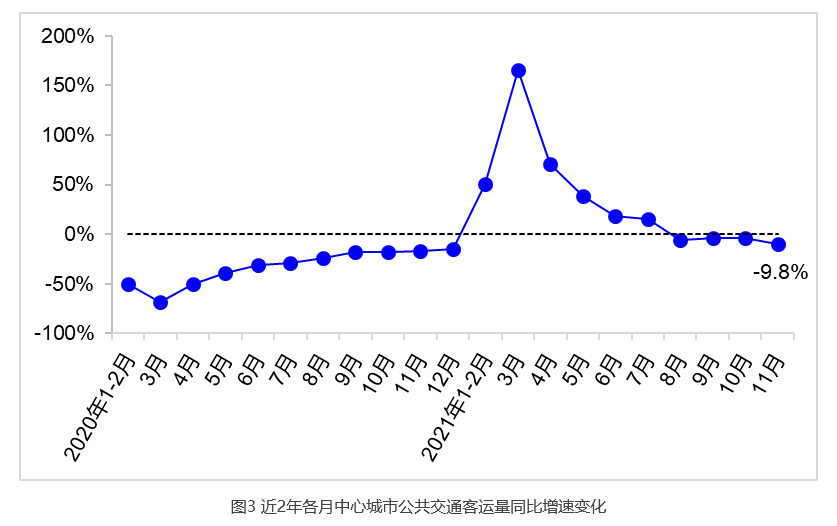 1-11月,36个中心城市完成公共交通客运量483.7亿人,同比增长23.4%,两年平均下降11.3%。分方式看,公共汽电车、轨道交通、巡游出租车和轮渡客运量分别完成208.6亿人、209.5亿人、65.1亿人和4489万人,同比分别增长14.4%、38.7%、11.7%和35.6%。