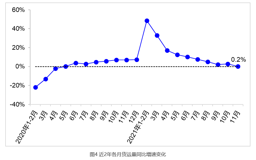 11月,完成营业性货运量46.6亿吨,同比增长0.2%,两年平均增长3.6%、增速较10月放缓1.3个百分点。其中,完成公路货运量34.8亿吨,同比下降1.3%;完成水路货运量7.6亿吨,同比增长4.3%。
