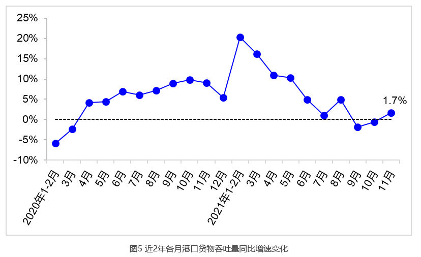 11月,全国港口完成货物吞吐量13.4亿吨,同比增长1.7%,两年平均增长5.3%、与10月基本持平。其中,内、外贸吞吐量同比分别增长0.7%和4.2%。完成集装箱吞吐量2417万标箱,同比基本持平,两年平均增长4.3%。