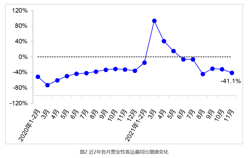 11月,完成营业性客运量5.4亿人,同比下降41.1%,两年平均下降37.0%、降幅较10月扩大5.4个百分点。其中,完成公路营业性客运量3.7亿人,同比下降43.3%;完成水路客运量969万人,同比下降33.7%。