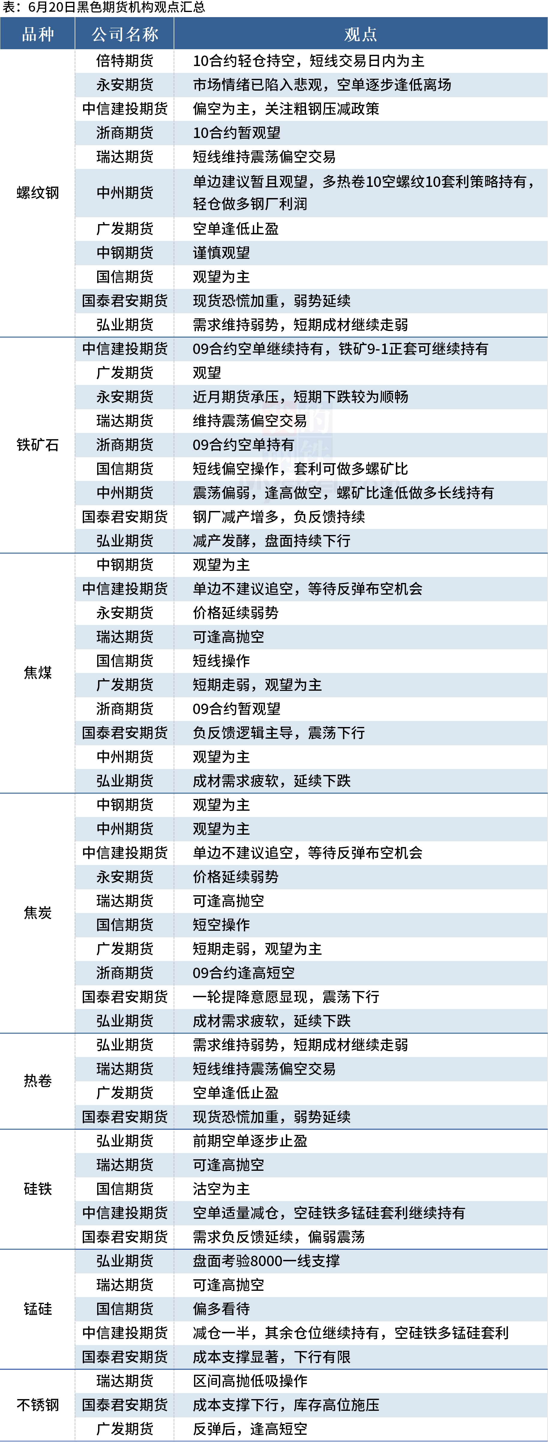 据Mysteel统计6月20日11家期货机构操作策略,其中多数机构看空螺纹钢铁矿石,建议焦煤。焦炭暂观望。具体汇总内容如下: