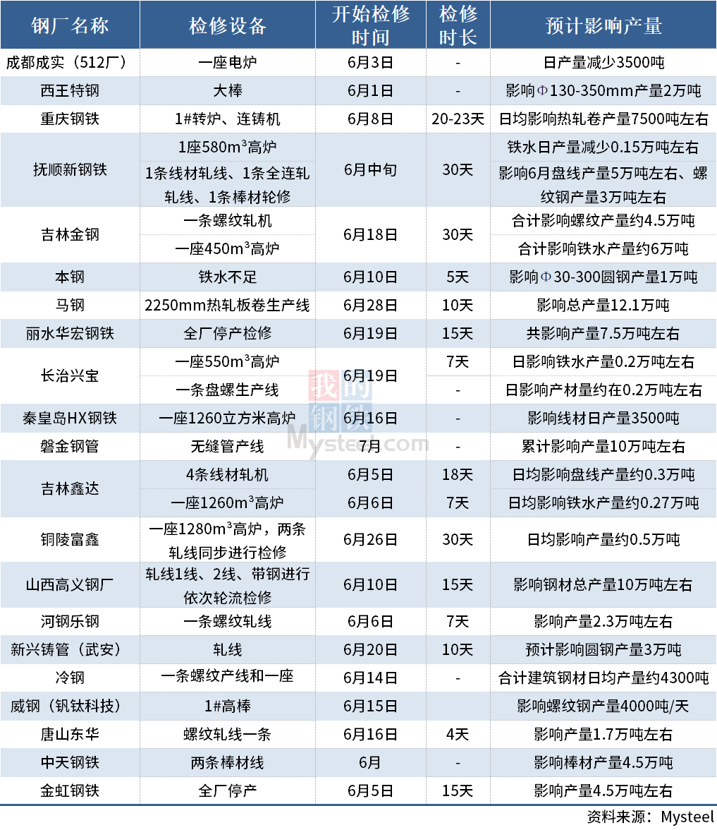 据Mysteel不完全统计,截至6月20日,国内21家钢厂发布检修计划。其中,丽水华宏钢铁制品有限公司预计于6月19日-7月3日全厂停产检修,预计共影响产量7.5万吨左右。