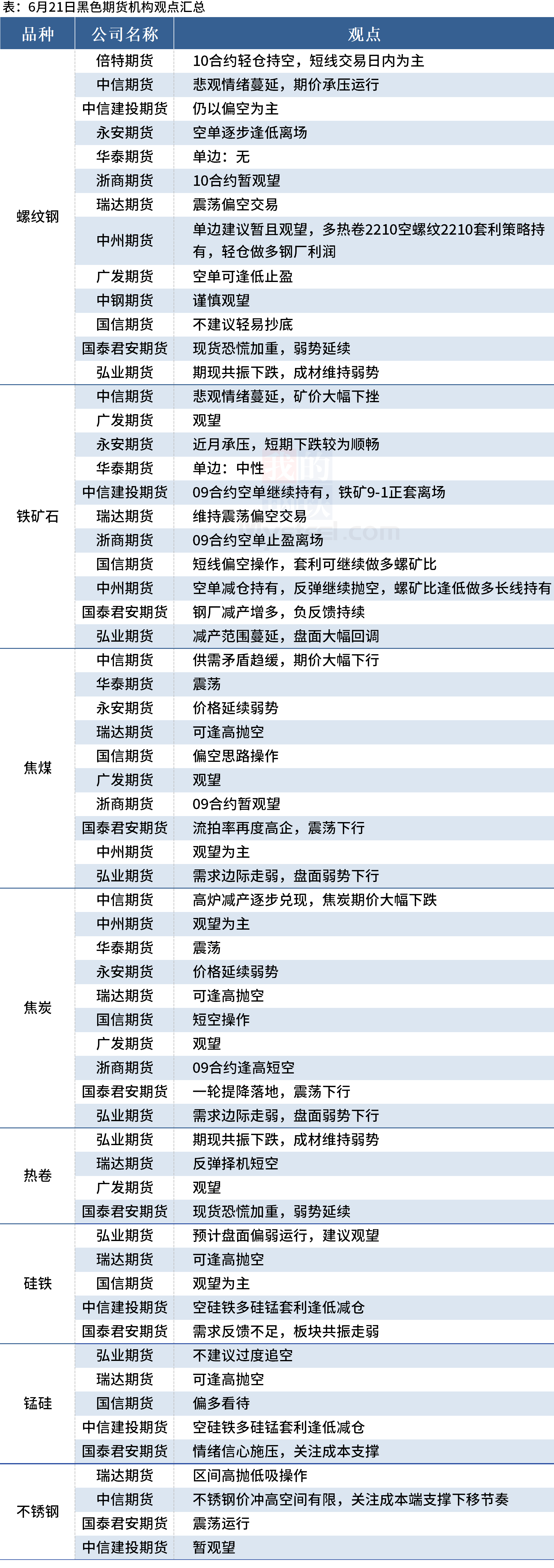 据Mysteel统计6月21日13家期货机构操作策略,其中多数机构看空螺纹钢铁矿石,建议焦煤。焦炭暂观望。具体汇总内容如下: