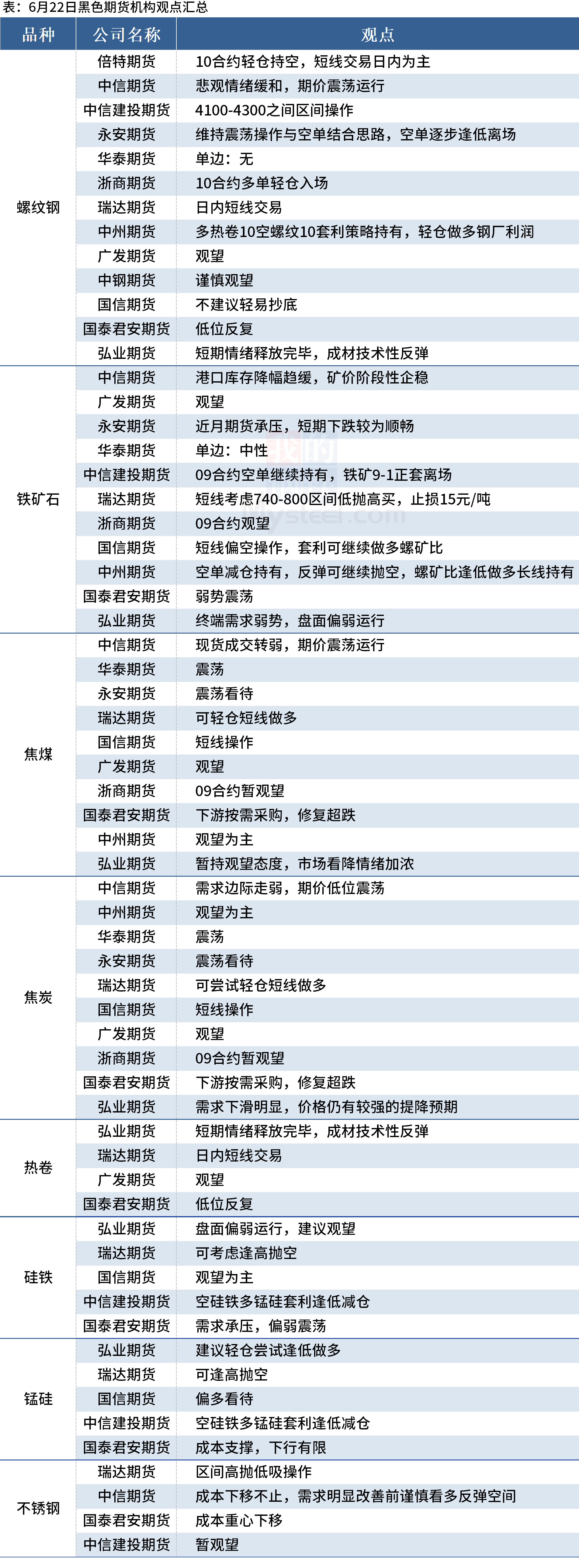 据Mysteel统计6月22日13家期货机构操作策略,其中多数机构看空铁矿石,预计螺纹钢震荡运行,焦煤。焦炭震荡看待。具体汇总内容如下:
