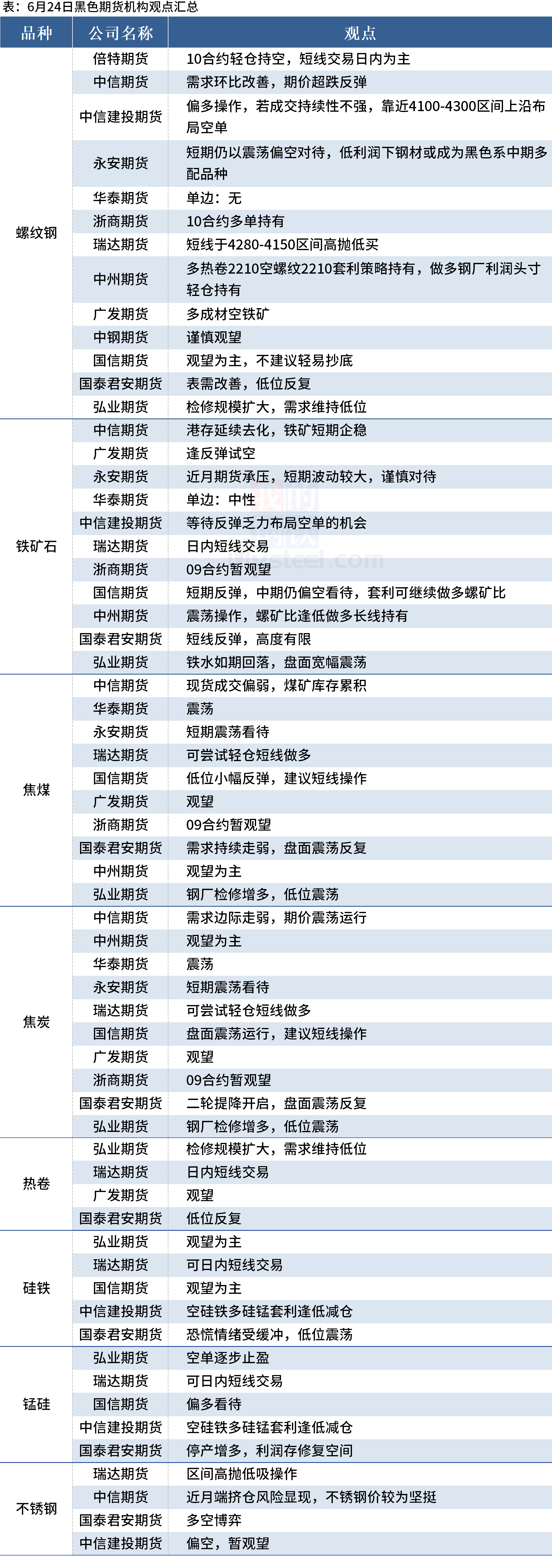据Mysteel统计6月24日13家期货机构操作策略,其中多数机构料铁矿石短线反弹,螺纹钢仍偏空,焦煤、焦炭盘面震荡运行。具体汇总内容如下: