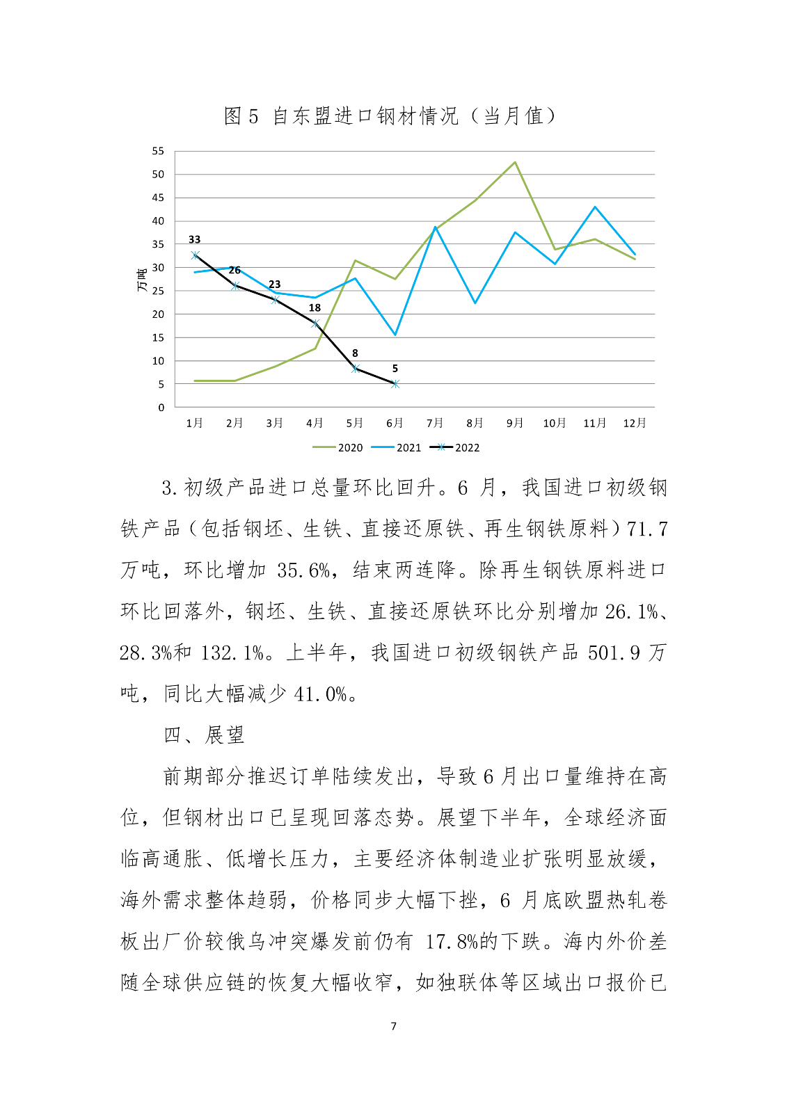 2022上半年,我国累计出口钢材3346.1万吨,同比减少10.5%;累计进口钢材577.1万吨,同比减少21.5%;累计进口钢坯373.8万吨,同比减少35.0%;累计出口钢坯78.7万吨,同比增加显著;折合粗钢净出口2563.6万吨,同比增加20.6万吨,增幅为0.8%。