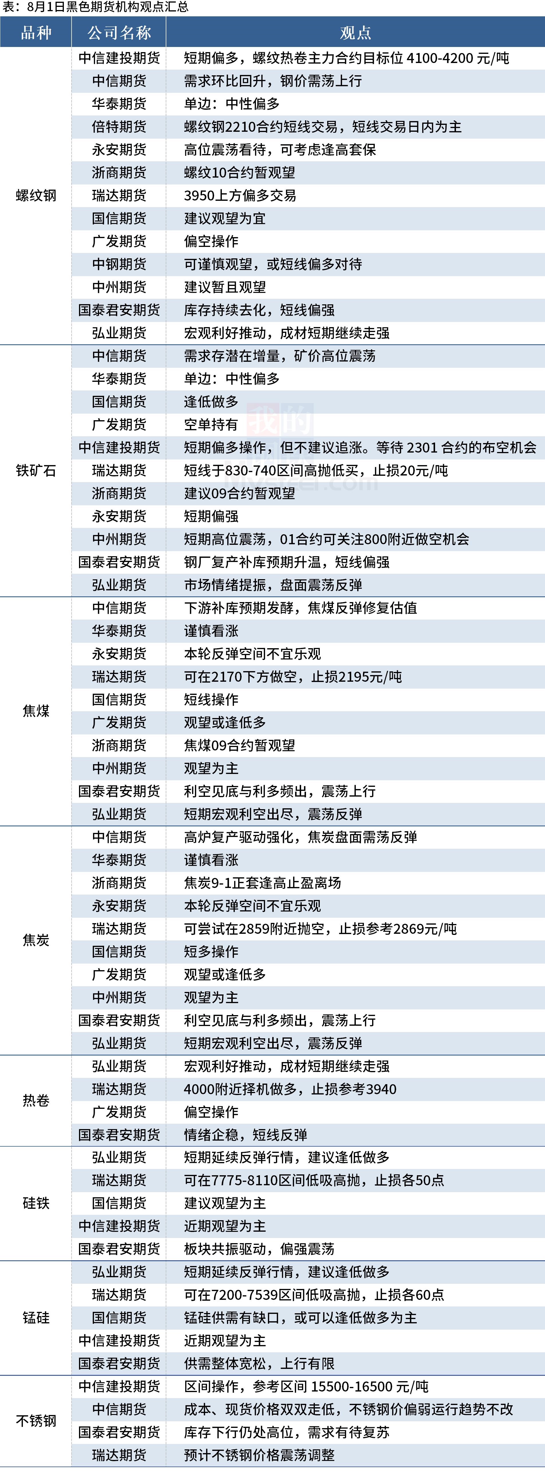 Mysteel统计8月1日13家期货机构操作策略,其中多数机构建议螺纹钢震荡偏强,铁矿石震荡偏强,预计焦煤、焦炭暂观望。具体汇总内容如下: