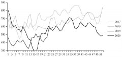 图为我国铁矿石港口库存季节性变化(周度)(单位:万吨)