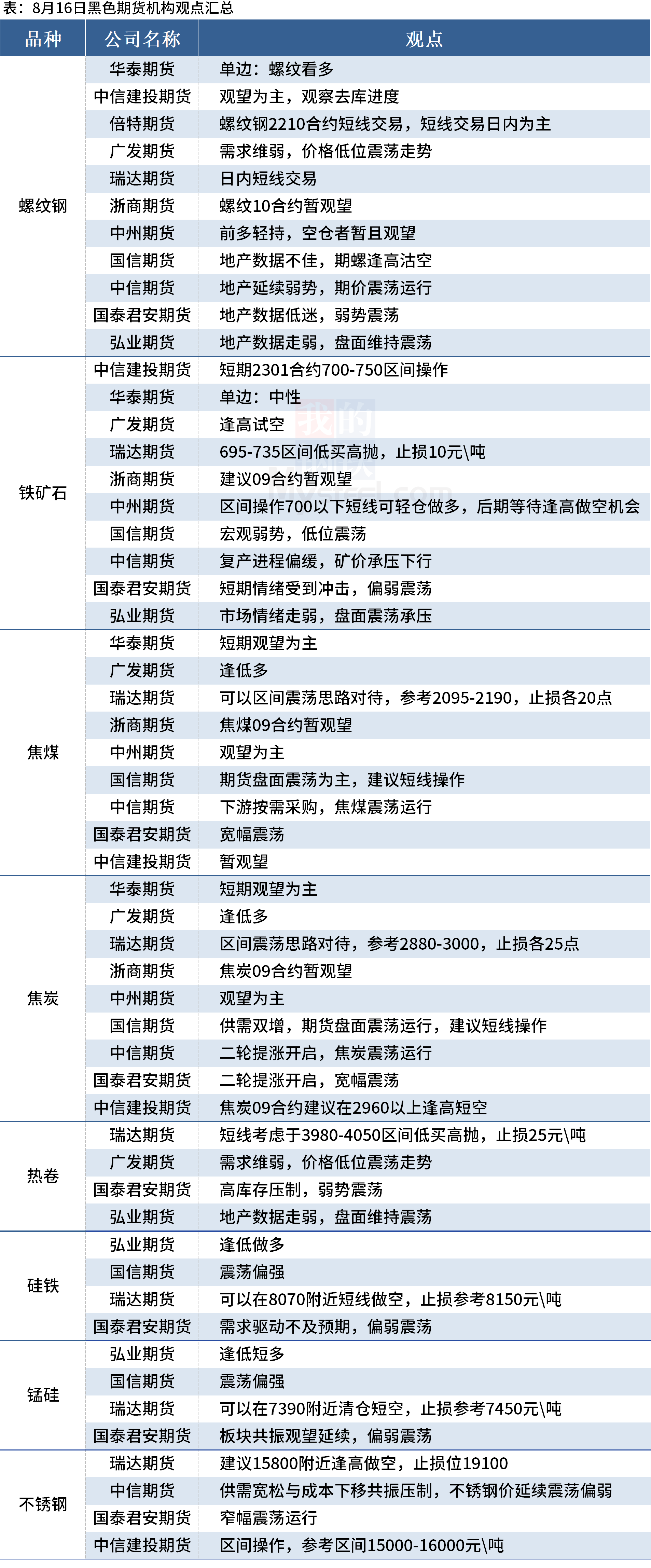 据Mysteel统计8月16日11家期货机构操作策略,其中多数机构料螺纹钢震荡运行,建议铁矿石震荡偏弱,焦煤、焦炭震荡运行。具体汇总内容如下: