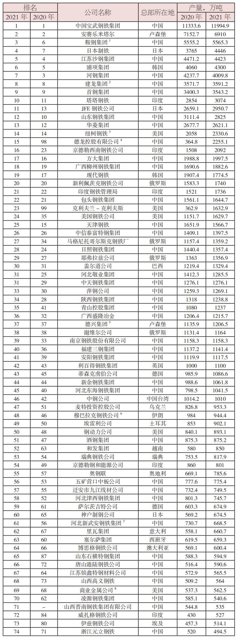 (1)鞍山集团2021年产量包括去年单独上市的本溪钢铁 ( 集团 ) 特殊钢有限责任公司 ;
