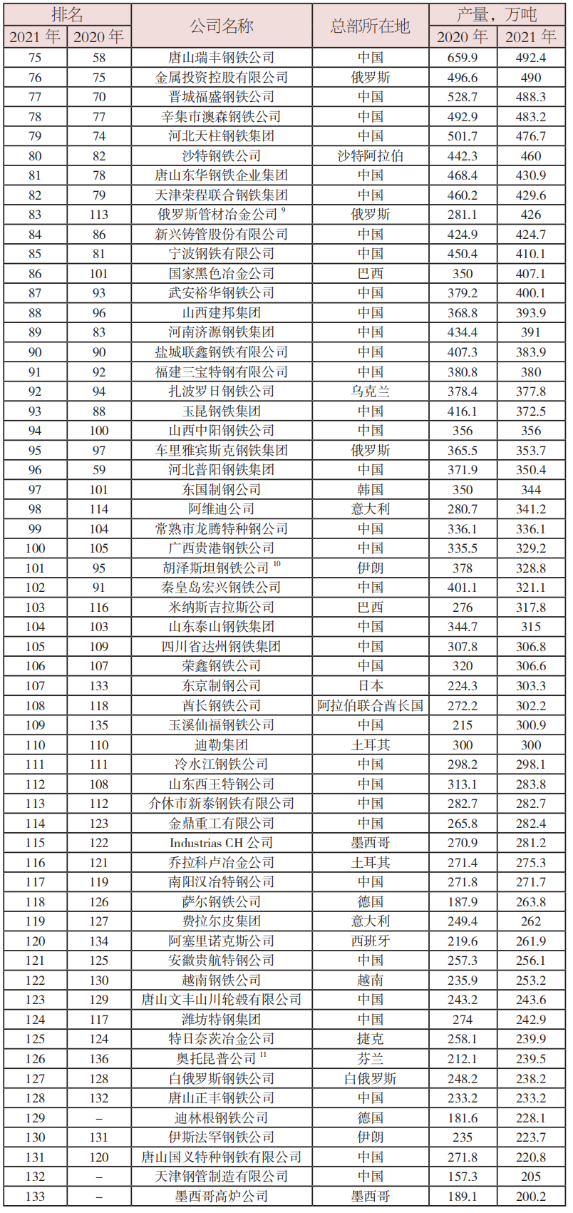 英国行业研究机构《金属通报》(MetalBulletin)近日公布2021年全球钢铁企业粗钢产量排名。今年的排行榜上全球共有133家钢铁企业粗钢产量超过200万吨,比去年少四家,其中中国企业为72家,数量占排名企业的54.1%;榜单新增企业四家,其中有两家中国钢铁企业,分别为山西晋南钢铁集团有限公司和天津钢管制造有限公司。