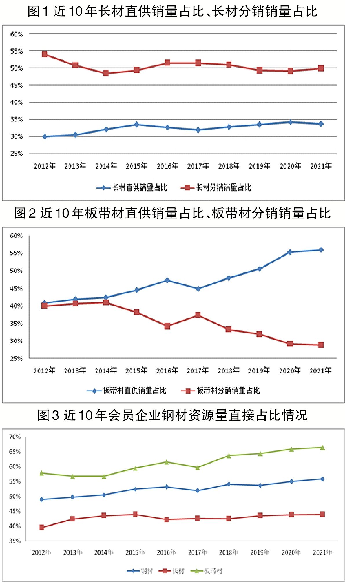 近10年会员企业长材资源量直接占比基本保持稳定,除2012年长材资源量直接占比低于40%外,2013年—2021年长材资源量直接占比基本在43%上下波动,其中2015年为43.96%,仅低于2021年的43.99%。上述现象表明,近10年会员企业对长材资源的掌控能力没有出现实质性变化,这主要与长材具有较明显的分销属性相关联,同时与多数长材应用于建筑领域,而钢铁生产与建筑施工在生产方式及节奏上存在较大差异性有关。钢铁企业向建筑企业直接供货,需要在钢材配送、库存协调、钢材二次加工、资金结算周期等方面进行充分协调。全国部分大型建筑施工企业(如中铁建等)虽然直接向钢铁企业购买钢材,但通常是由其内部采购部门进行规模化采购,以提高议价能力,并不是真正意义上的“点对点”直供销售。鉴于长材分销销量占比始终大于长材资源量直接占比,据此判定在与长材终端用户沟通与服务方面,经销商目前拥有较大的影响力。