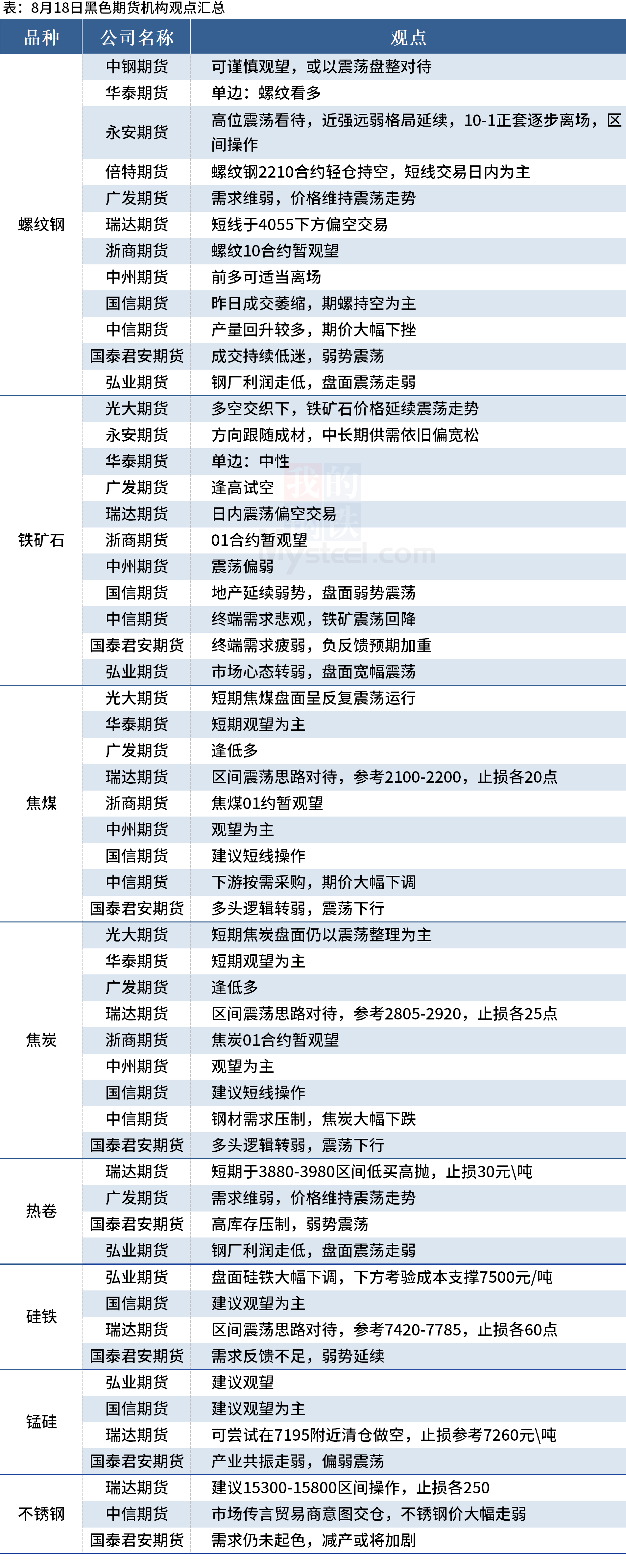 据Mysteel统计8月18日12家期货机构操作策略,其中多数机构料螺纹钢震荡运行,建议铁矿石震荡偏弱,焦煤、焦炭暂观望。具体汇总内容如下: