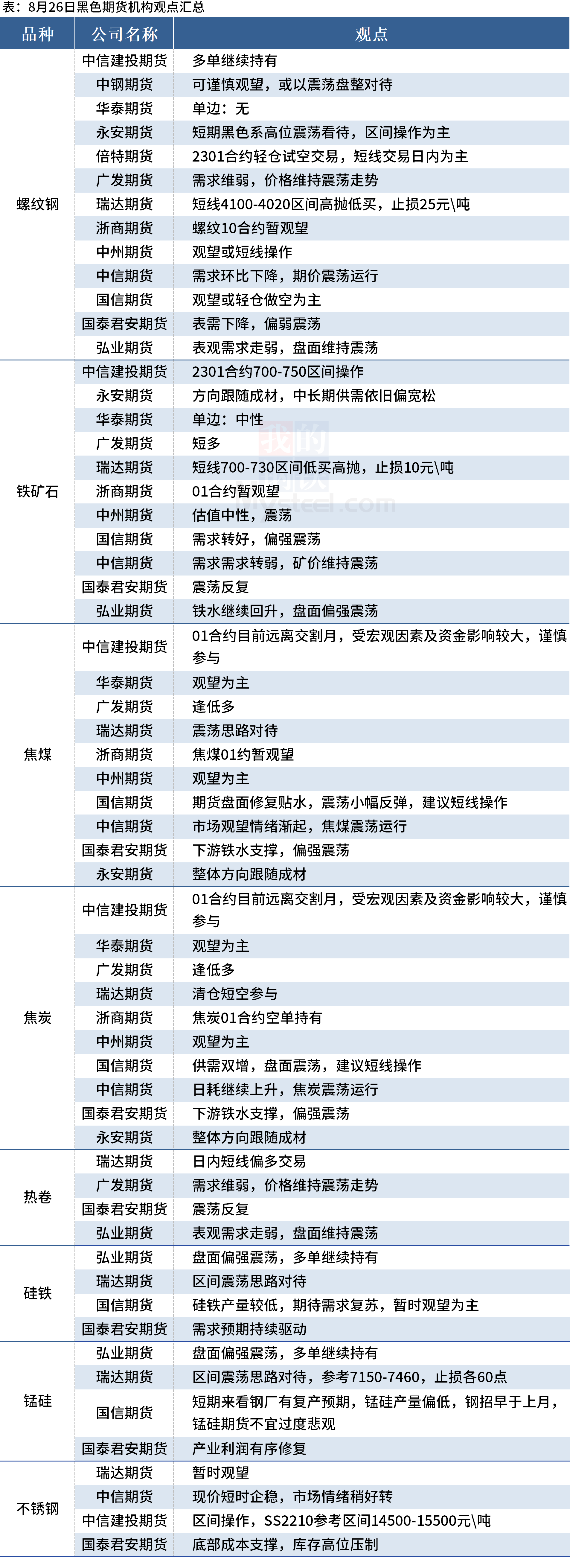 据Mysteel统计8月26日13家期货机构操作策略,其中多数机构料螺纹钢震荡运行,建议铁矿石震荡运行,焦煤、焦炭震荡运行。具体汇总内容如下: