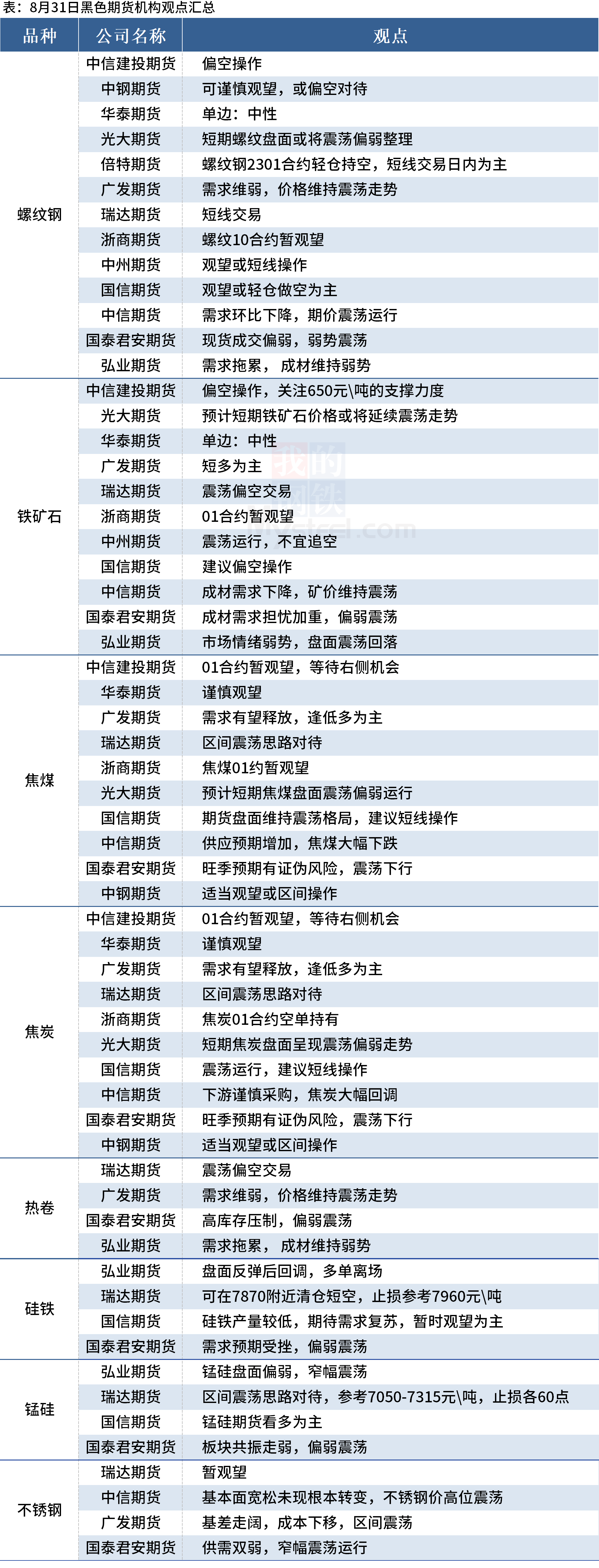 据Mysteel统计8月31日13家期货机构操作策略,其中多数机构料螺纹钢震荡偏弱,建议铁矿石震荡偏弱,焦煤、焦炭震荡运行。具体汇总内容如下: