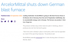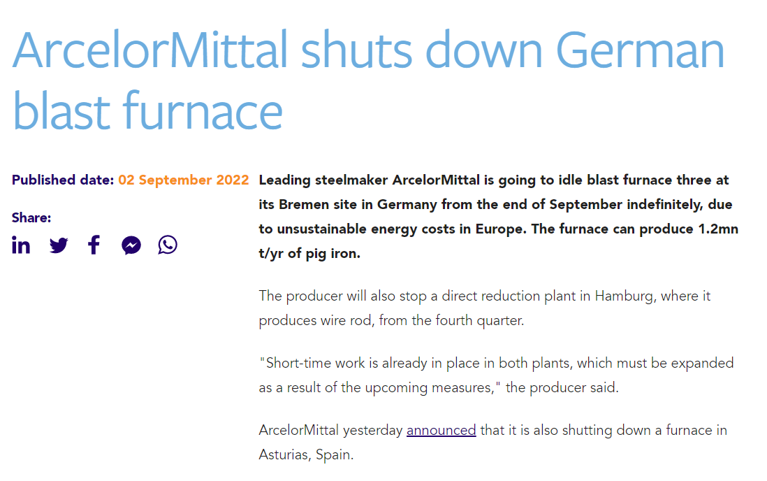 9月2日,全球第二大、欧洲最大钢铁集团安赛乐米塔尔(Arcelor Mittal)发布公告称,将在未来几个月里部分关闭两座德国工厂的产能。剧烈波动的能源价格和经济前景不确定性是公司作出这项决定的背景。