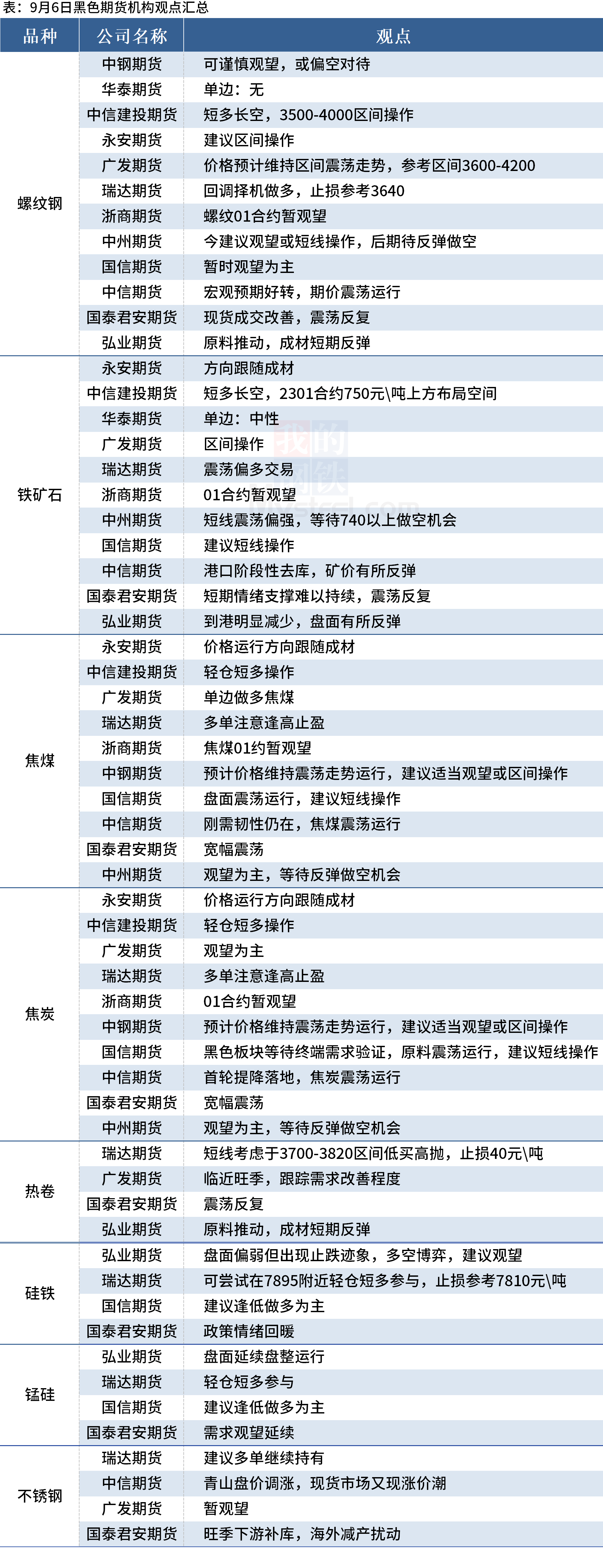 据Mysteel统计9月6日12家期货机构操作策略,其中多数机构料螺纹钢震荡运行,建议铁矿石震荡运行,焦煤、焦炭震荡运行。具体汇总内容如下: