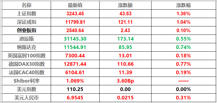 1、沪指放量涨1.36%收复3200点