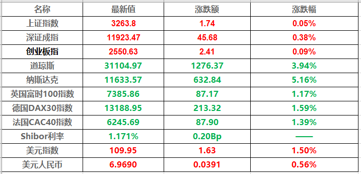 1、沪指震荡微涨0.05%